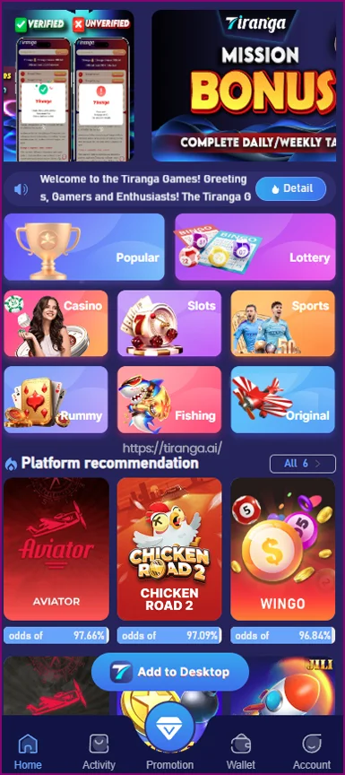 Add Funds: Put a small amount in your Tiranga account to start playing.